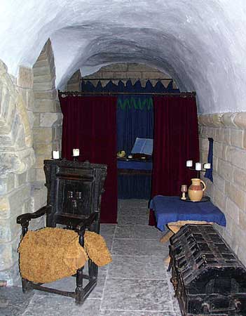The Queens bedchamber in the Keep at Newcastle upon Tyne. The castle stands on a steep sided promontroy overlooking the River Tyne. It is a readily defensible site which has been occupied for nearly 2,000 years. Flint flakes and a stone axe head found in archeological excavations hint at prehistoric activity.