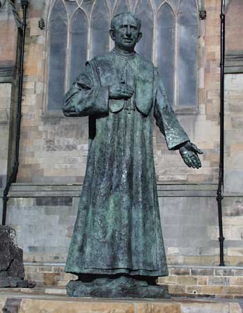 The statue of Cardinal Hume was unweiled by Queen Elizabeth II on May 7th 2002 in the year of Her Majesty's Golden Jubilee. The tree metre sculpture shows Cardinal Hume in his Benedictine monk's habit wearing a cardinal's skull cap and the cross of St. Cuthbert.. The statue is set in a garden that reflects his love of the holy landscape of Northumbria and of the Northern Saints and stands on a sandstone platform in the shape of Holy Island (Lindisfarne).