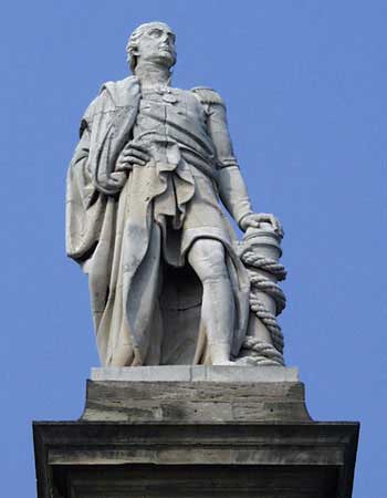 The Collingwood Monument celebrates the life and achievements of Admiral Lord Collingwood. Born the son of a Newcastle merchant in 1748, Cuthbert Collingwood first went to sea in 1761 and rose swiftley through the naval ranks as first the American War of Independence and then the Napoleonic War pitched him into a number of victorious encounters. His connection with Lord Nelson began in the 1770's and it was as Nelson's second in command at the Battle of Trafalgar that Collingwood achieved his greatest notoriety, both of master of his ship the Royal Sovereign and by taking command of the battle on the death of Nelson. Following Trafalgar he was awarded a peerage but died at sea in 1810 and was later buried in St. Paul's Cathedral. His statue was sculpted by John Graham Lough and stands atop a pedestal designed by John Dobson. The position of the monument marked Collingwood's family connection with North Shields, allowed the statue to be seen from the sea and the river, and let the great man stare out to sea his hand resting on a rope wrapped bollard. The four cannon on the walls flanking the steps at its base came from his flagship and were added to the monument in 1849, four years after its original completion.
