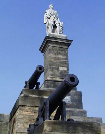 The Collingwood Monument celebrates the life and achievements of Admiral Lord Collingwood. Born the son of a Newcastle merchant in 1748, Cuthbert Collingwood first went to sea in 1761 and rose swiftley through the naval ranks as first the American War of Independence and then the Napoleonic War pitched him into a number of victorious encounters. His connection with Lord Nelson began in the 1870's and it was as Nelson's second in command at the Battle of Trafalgar that Collingwood achieved his greatest notoriety, both of master of his ship the Royal Sovereign and by taking command of the battle on the death of Nelson. Following Trafalgar he was awarded a peerage but died at sea in 1810 and was later buried in St. Paul's Cathedral. His statue was sculpted by John Graham Lough and stands atop a pedestal designed by John Dobson. The position of the monument marked Collingwood's family connection with North Shields, allowed the statue to be seen from the sea and the river, and let the great man stare out to sea his hand resting on a rope wrapped bollard. The four cannon on the walls flanking the steps at its base came from his flagship and were added to the monument in 1849, four years after its original completion.