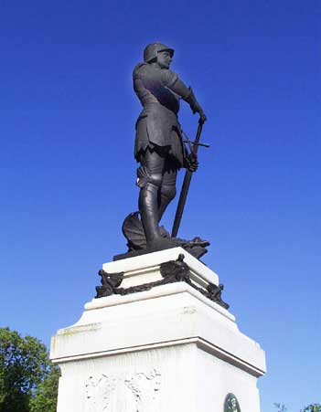 Situated next to the West end of St. Thomas's Church at Barras Bridge. This statue has a central pedestal surmounting a curved ensemble of Portland Stone steps, terrace and benches. This is a First World War Memorial to the fallen of the 6th (Territorial) Battalion of Northumberland Fusiliers. There is also an added World War Two dedication to the 43rd and 49th Battalion Royal Tank Regiment. The life size bronze figure stands sheathing his sword over the severed head of the dragon while the pedestal below is decorated with an enamel on the same theme.