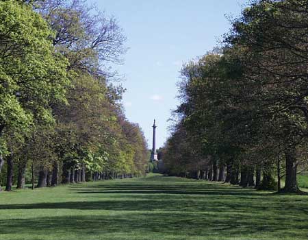 A view along the avenue of turkey oaks towards the Column of British Liberty. The Statue which stands on a 140ft column was originally adorned with 66 blocks of gold leaf. According to popular local myth, there was a bag of gold coins or a golden apple hidden under Liberty's cap - and in the 19thC a miner fell to his death as he tried to reach the non-existent treasure. Location: Near Rowlands Gill, 6 miles South West of Gateshead. Telephone: (01207) 542255. |