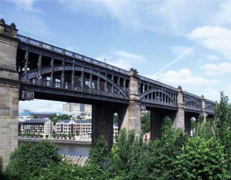 The High Level BridgeOpened: 28th September 1849 by Queen Victoria. The revolutionary design with trains on the top deck and a road below. It was the first bridge built with both cast and wrought iron. Trains first crossed 15th August 1849 - no ceremony. Road traffic first crossed 4th February 1850. The road deck was strengthened in 1922 to take trams. |