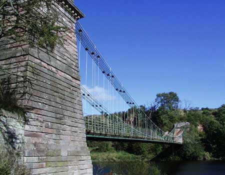 Union Bridge, HorncliffeOpened: 1820. Horncliffe is a quiet village on a bluff above the wooded banks of the River Tweed with a surprising and beautiful bridge for the least used of the four roads crossing the river into Scotland. This was the first suspension bridge to be built in Britain (1820). |