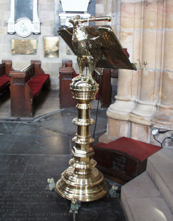 The LecternThe lectern is placed near the division between the chancel and the nave on which the Bible rests for reading during services. Usually in the shape of an eagle with the Bible resting on its outstretched wings. The eagle was thought to be able to look unflinchingly into the heart of the sun, in the same way the words from the Bible are an unflinching revelation of God. |