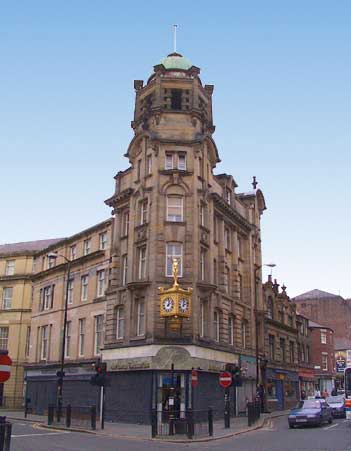 The splendid Art Nouveau turret and offices were built up against, and into, Grainger's shops and houses of Clayton Street West. The 1910 property picks up on the usual grand columns but embeds large square blocks into them. It also adds stone shelves at the second floor and takes great stone vanes through the windows on the fourth floor. The whole building is confidently topped off with an open turret with a green copper dome and flag pole.
