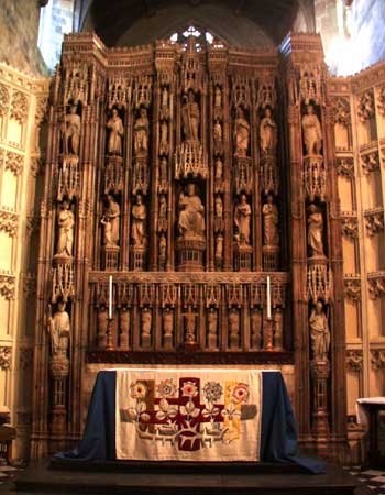 ReredosAn ornamental screen covering the wall at the back of the altar, carved in wood or stone. |