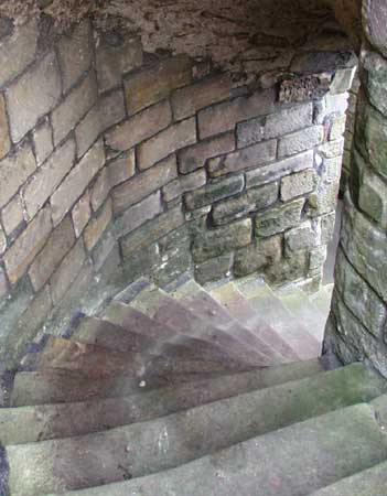 Spiral StaircasesThese wind around a central pillar inside towers, they connect the separate storeys of the castle. This staircase in Warkworth Castle is unusual, in that the spiral is clockwise. Most are anti-clockwise, this was to give a right handed defender the advantage over a right handed attacker trying to mount the stairs from the bottom. |