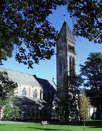 St. George's Church, consecrated in 1888. A local shipbuilder, Charles Mitchell, appointed his shipyard architect, Thomas Ralph Spence, to design and build St. George's. The result is a Church that cannot easily be labelled, with a splendid Italianate tower dominating Jesmond and an ornate chancel, baptistry and roof of great artistic merit; the use of tile and mosaic in the style of Art Nouveau is particularly striking. The organ is one of the best in the diocese and the musical tradition continues in the context of the Family Communion.