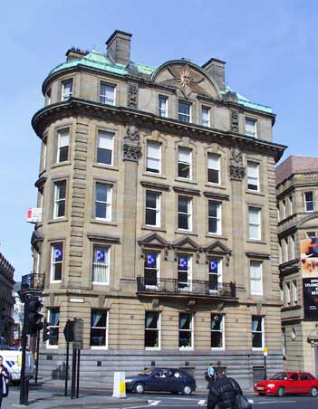 The Sun Insurance Building of 1902-4 Architects: Oliver, Leeson and Wood.Another Oliver, Leeson and Wood grand finance building using the familiar features of heavy cornice, giant Corinthian pilasters, pedimented windows and heroic figures supporting the central canopy. The Westgate Road elevation is topped by a huge golden sunburst and the wrought-iron balconies carry smaller sun motifs. |