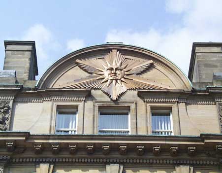 Another Oliver, Leeson and Wood grand finance building using the familiar features of heavy cornice, giant Corinthian pilasters, pedimented windows and heroic figures supporting the central canopy. The Westgate Road elevation is topped by a huge golden sunburst and the wrought-iron balconies carry smaller sun motifs. In this lower stretch of Westgate Road, William Bell, one of the Royal Academy's first gold medalists, taught the art of drawing.